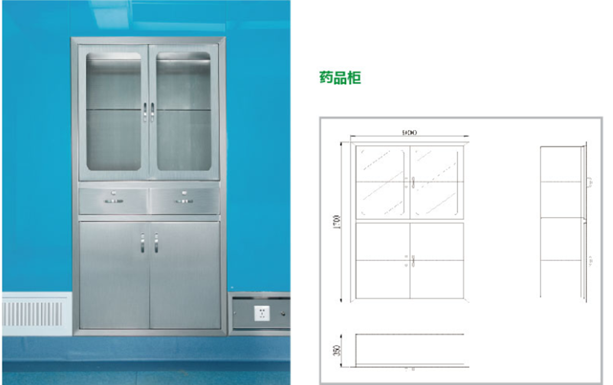 内嵌式,柜身采用优质拉丝不锈钢板精制而成,柜体分上下两层,每层采用双开平开门,上下两层无所有调节玻璃隔层,柜门内外无所采用不锈板衬面,上层柜门均为玻璃门,柜边全部为不锈钢翻边装饰收口。药品柜两层之间为两个不锈钢抽屉,麻醉柜中间为2个不锈钢抽屉,并加配个拉式记录板。( 可定做其它规格)